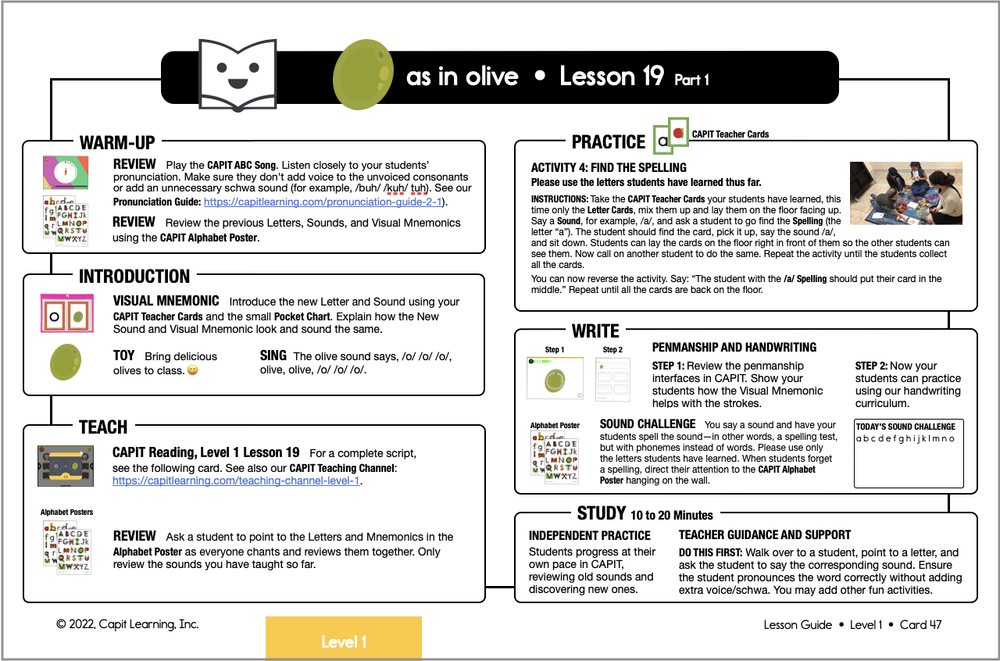 Detailed Lesson Guides containing comprehensive lesson plans, creative and collaborative practices, and lesson scripts that help teachers teach phonics clearly and explicitly.